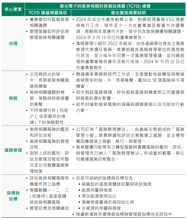 在全球暖化日益加剧与极端气候事件频繁发生的背景下,所有企业都面临前所未有的挑战与机遇。利害关系人更加重视企业气候策略与行动的有效性与透明度。亿光电子密切关注全球气候变迁趋势及国际因应方向,并采纳由金融稳定委员会(FSB)设立的 气候相关财务揭露工作小组(TCFD) 所推荐的框架,用以评估气候变迁所带来的风险与机会。通过该框架,公司检视潜在的调适与减缓措施,以及其可能产生的财务影响。同时,亿光电子积极规划在近期提升揭露的清晰度与完整性,以赢得客户、投资人及公共部门利害关系人对公司气候策略的全面支持。