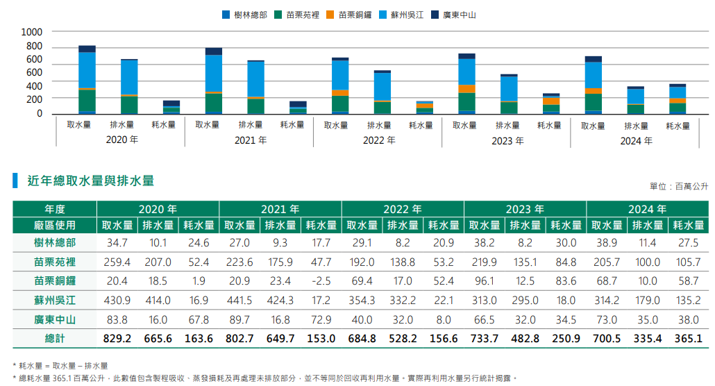 2024 年,亿光电子总取水量为 7.005 亿公升,相较 2023 年的 7.337 亿公升减少约 4.5%,展现了公司在推动节水与提升用水效率方面的持续努力与实际成果。公司的主要取水来源为工业自来水及当地市政供水系统,且所有厂区均未位于缺水地区。为强化水资源管理,各营运据点已实施多项关键措施,包括在生产制程中导入节水设计、管线系统的漏水侦测与管控,以及优化冷却与清洗程序以降低非必要用水。此外,公司也透过员工教育与宣导活动,积极推动节水行为,以提升日常用水效率。值得一提的是,吴江苏州厂于 2024 年导入制程废水回收系统,大幅减少废水排放,并使处理后的水得以在生产过程中再利用,有效提升整体水资源使用效益。